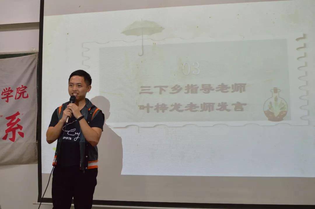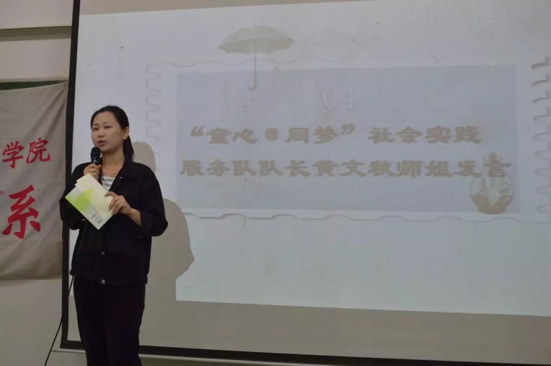 同时,会议通过PPT展示了经济学系“童心·同梦”社会实践服务队在广东省清远市阳山县江英镇中心小学开展的三下乡活动的活动照片,以此让在场的观众对我们的团队有更深的了解。接着,三下乡指导老师叶梓龙老师和队长黄文秋师姐进行发言,更加详细地解释了三下乡的含义、意义,并介绍“童心·同梦”社会实践服务队这个拥有七年下乡经历的团队,经验丰富,强调团队合作的重要性,在下乡的过程中相互磨合,建立深厚的友谊。